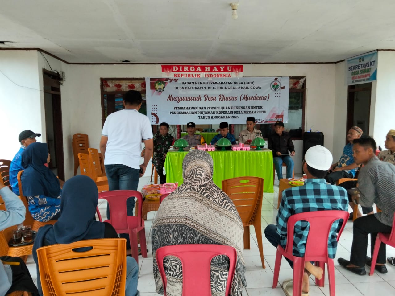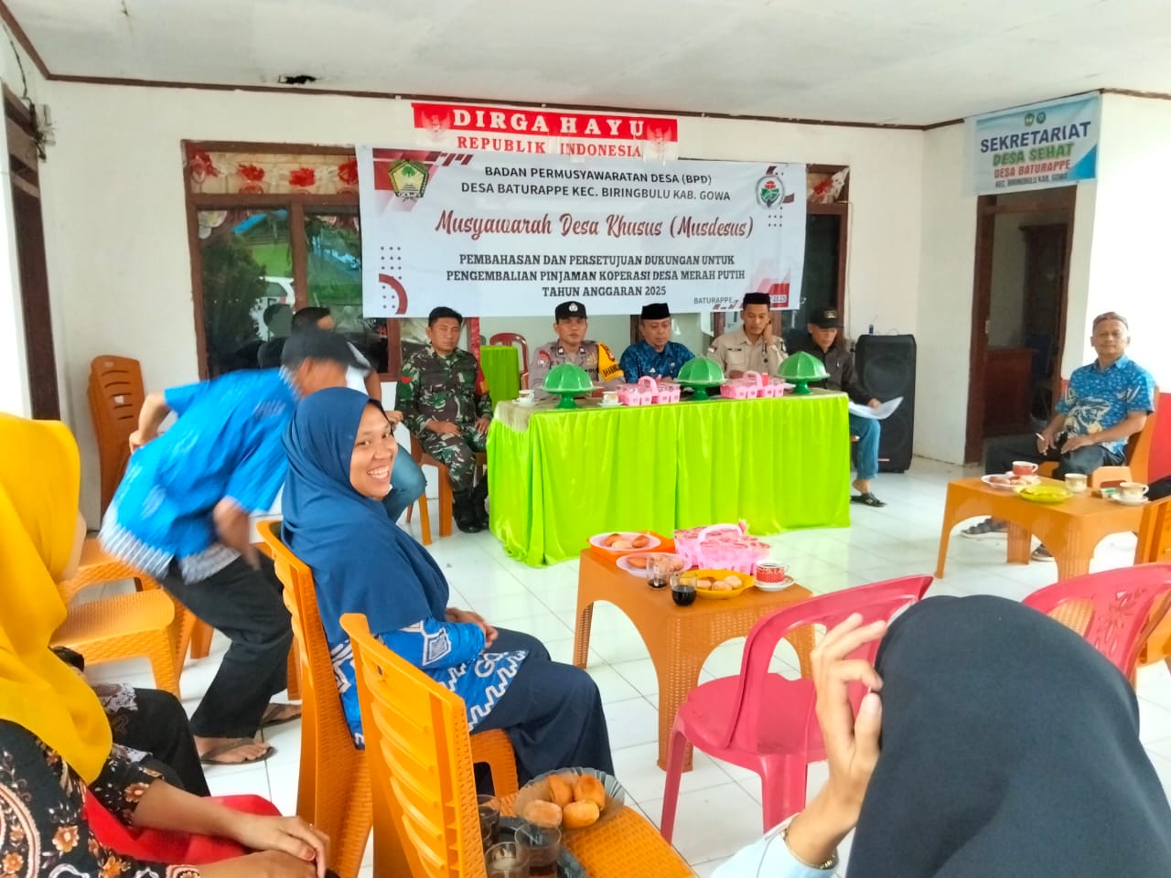 Pemerintah Desa Baturappe, Kabupaten Gowa, bersama Badan Permusyawaratan Desa (BPD) telah menggelar Musyawarah Desa Khusus (Musdesus) pada Jumat, 31 Oktober 2025, untuk membahas dukungan pengembalian pinjaman Koperasi Desa Merah Putih. Acara ini diadakan di Desa Baturappe, Kecamatan Biringbulu, Kabupaten Gowa.